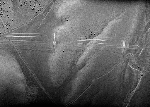Radar images are non-literal, or in other words, they are a reconstruction of a scene, not a photo of one. While still useful, coarse or grainy radar images such as those above can create the perception that interpreting all radar data is complicated. However, fine-resolution SAR images make it easy to identify many common features and objects. In the image below, terrain, brush, and infrastructure are all easily discernible. Yet, some radar phenomena are at play in the image as well. For example, the bright outlines of the powerline towers in the image below are instances of a SAR phenomenon called layover, and do not accurately represent the dimensions and locations of the towers.