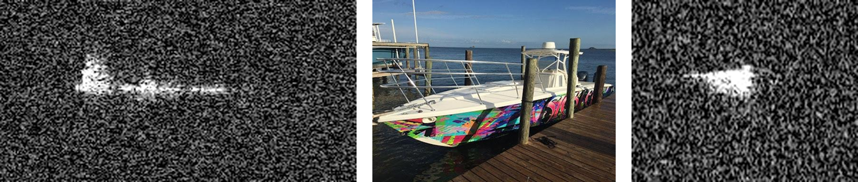 Fog rolls into the region. When environmental conditions such as high humidity, haze, fog, cloud cover, or darkness inhibit the effectiveness of the EO/IR system in identifying or classifying a target, sensor operators employ an Inverse SAR mode (ISAR), giving them the ability to focus on a target of interest. The radar transitions to a spotlight SAR mode on the target and begins outputting ISAR frames that can be used to identify the vessel. (In traditional SAR mapping mode, targets on water are blurred due to the vessel’s motion. The Inverse SAR mode relies on the pitching and rolling motion of the vessel to focus the imagery and identify features such as the size and number of masts).