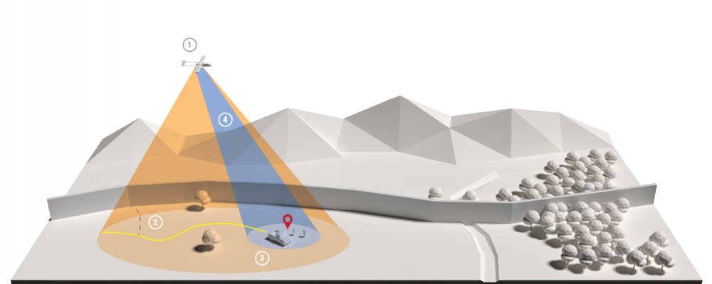 Mission specialists fly a manned aircraft parallel to the border, mapping the area with SAR imaging on consecutive flights. They cover both sides of the border searching for ingress and egress points.